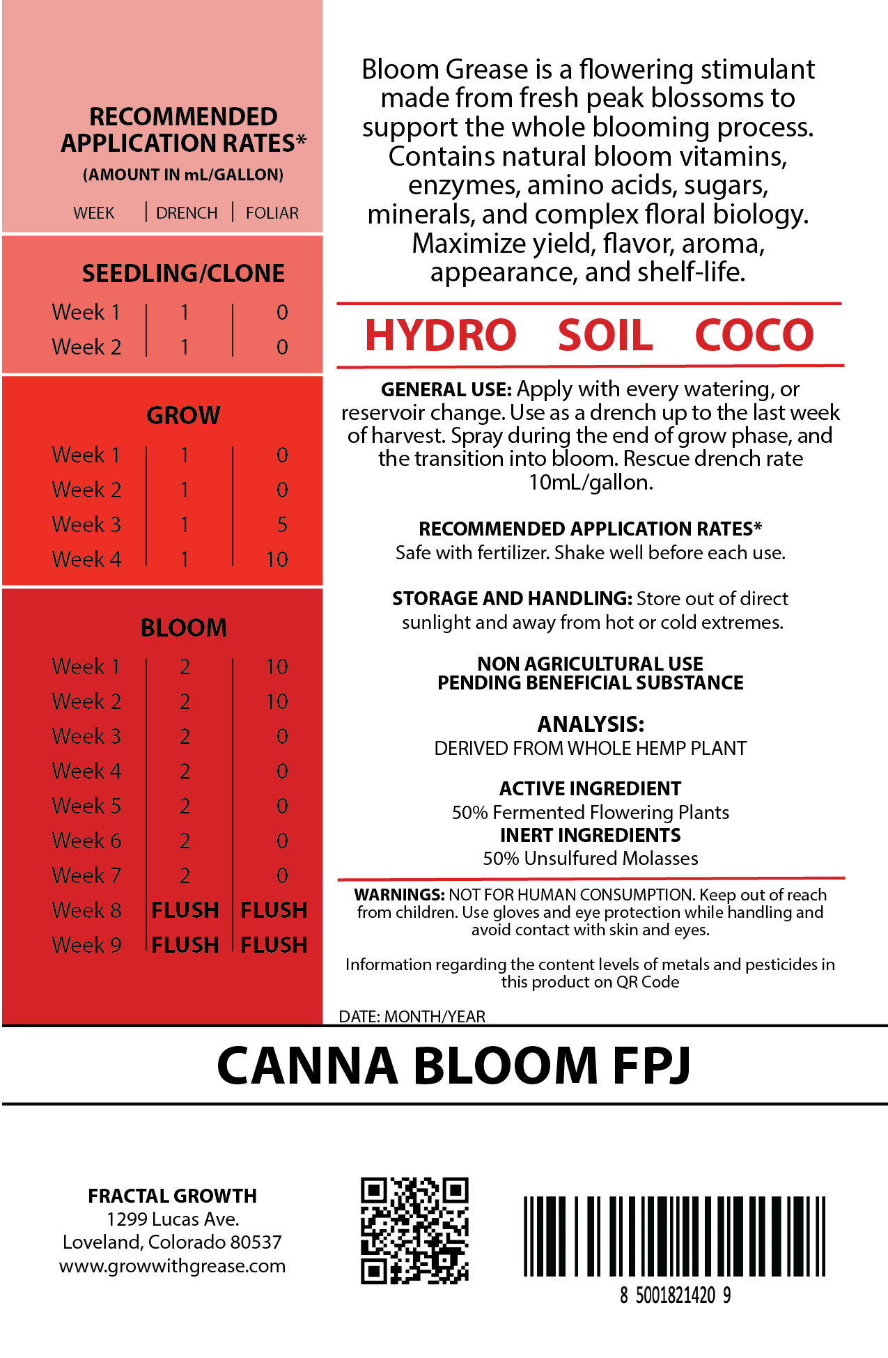 Fermented canna flowers preserved in sugar to benefit developing flowers. Bloom Grease is an all natural canna fermentation to capture the flowering juices within at peak bloom. Contains natural grow vitamins, enzymes, amino acid, sugars, minerals, and complex floral biology. Maximize yield, flavor, aroma, appearance, and shelf-life. Cost-effective and nutrient rich ferment, highly compatible with ALL fertilizers. If using as your base nutrient, DOUBLE the drench recommended rate on the bottle or feed chart.