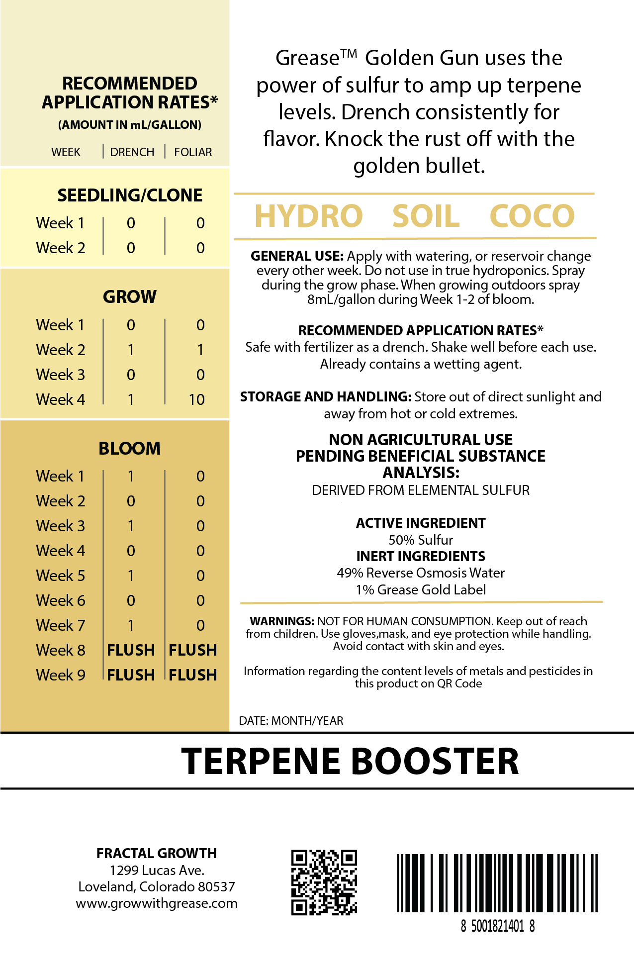 Harness the elemental power of sulfur to increase terpenes. Grease Golden Gun uses the power of sulfur to amp up terpene levels. Drench consistently for flavor. Knock the rust off with the golden bullet. Sulfur is an essential plant nutrient that plays a vital role in various biochemical processes within plants. It is involved in the synthesis of proteins, enzymes, vitamins, and other important compounds. When it comes to terpene production, sulfur availability can have a significant impact.